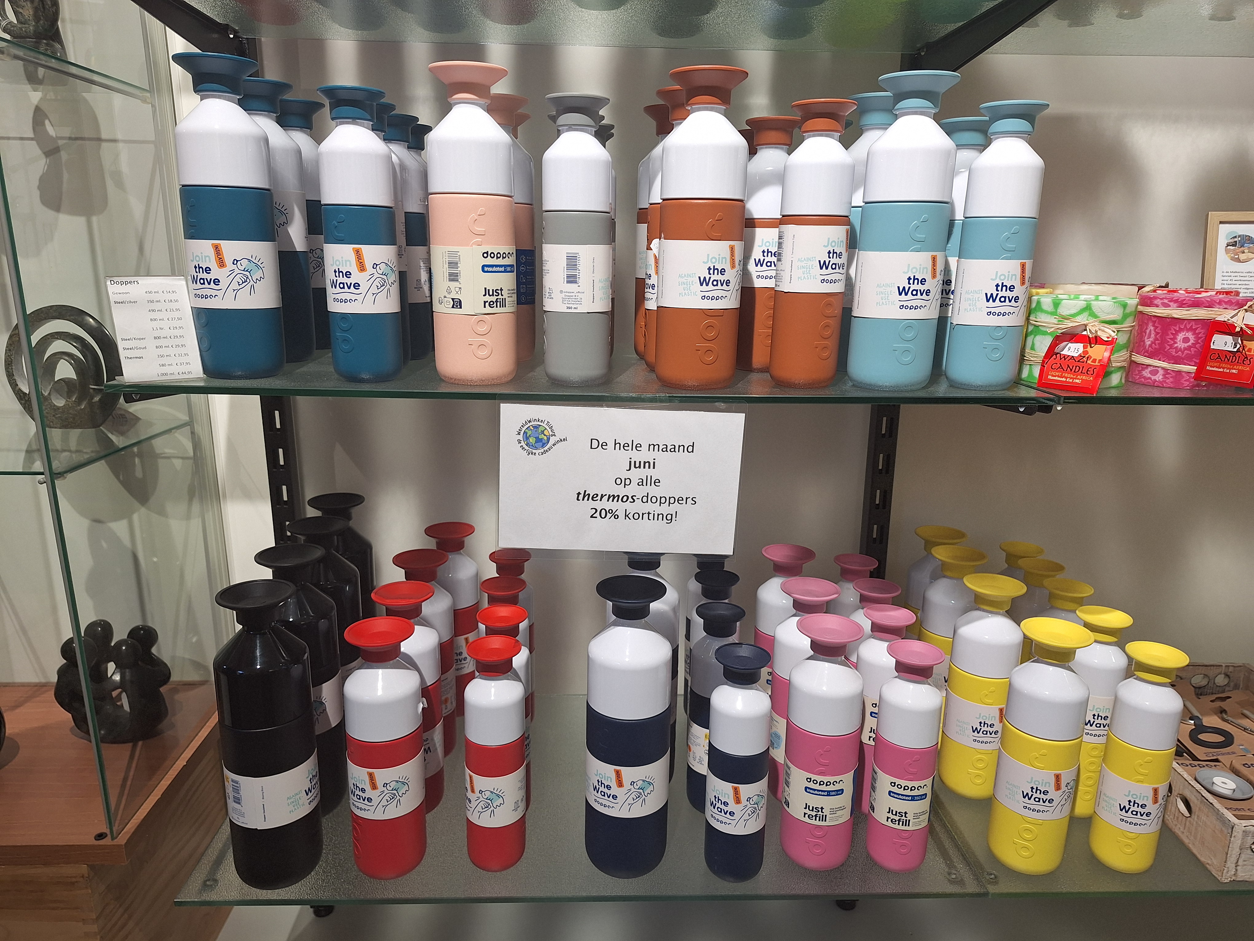 Wil jij graag voor de warme zomerdagen een fijne thermos-dopper hebben, waarin je koude dranken 24 uur koud blijven, en je met de koop van je dopper bijdraagt aan een schoon milieu? Kom dan nu naar onze Wereldwinkel, want je krijgt bij ons in de maand juni maar liefst 20% korting op zo'n mooie thermos-dopper (alle kleuren en maten doen mee).